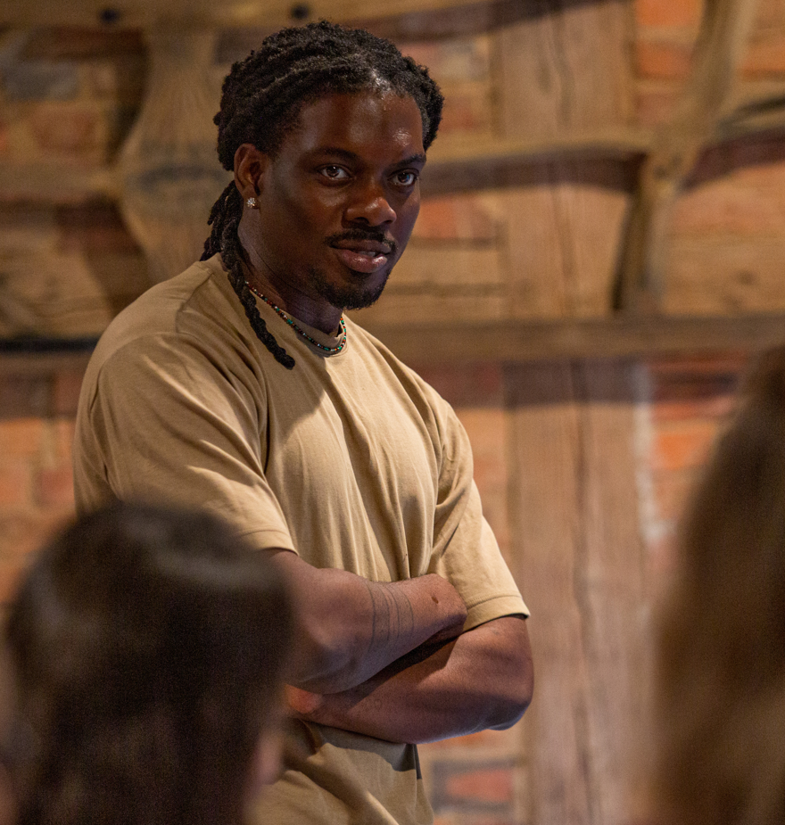 Diese Erfahrung verbindet Ken Nwadiogbu mit der Erinnerung an Menschen und Orte. So sind die Farben und Muster seiner Arbeiten von der Landschaft Lübens inspiriert. Ausgehend von der Sammlung ausgestopfter Vögel im Lübener Dorfmuseum schuf er zudem ein Gemälde mit einem Adler als Motiv.