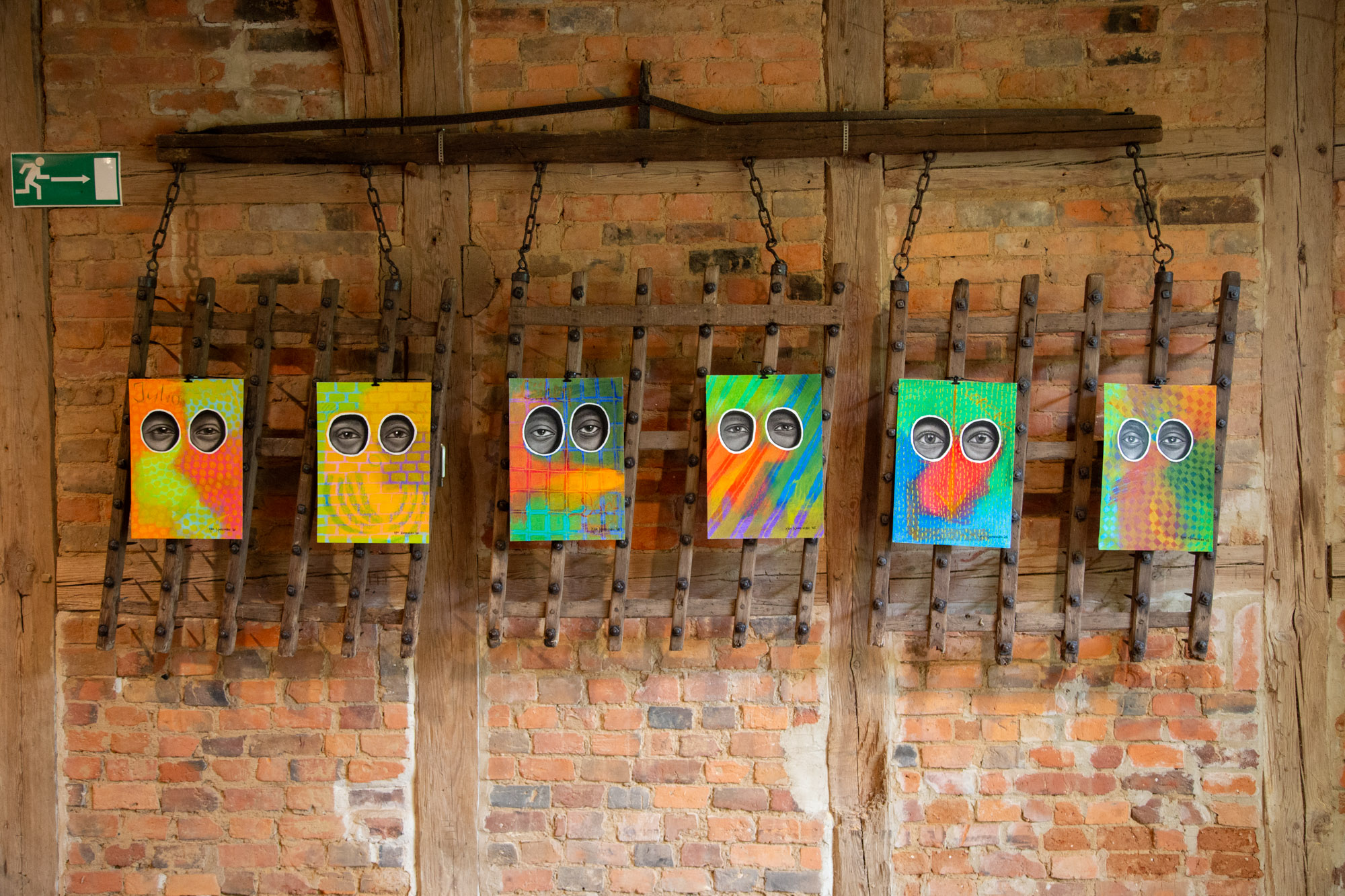 Die Serie Augenzeugen des nigerianischen Künstlers Ken Nwadiogbu befasst sich mit der Eigen- und Fremdwahrnehmung. In seinen Zeichnungen auf Papier blicken sechs Augenpaare die Betrachtenden an und stellen eine Verbindung zu diesen her. Wie wir uns selbst und andere mit Blicken konfrontieren und Kontakt suchen, ermöglicht einen intimen Austausch.